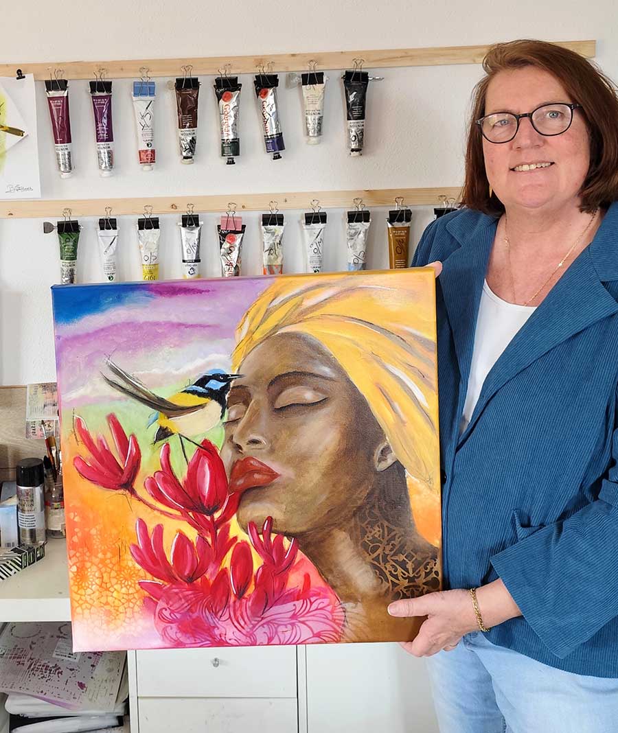Celebration of Love is a contemporary painting inspired by my deep connection to nature and the powerful emotions it can awaken. In this artwork, I painted a woman surrounded by blooming flowers with a small bird close to her — a quiet moment that reflects the simple joy of being present in nature and feeling truly alive.