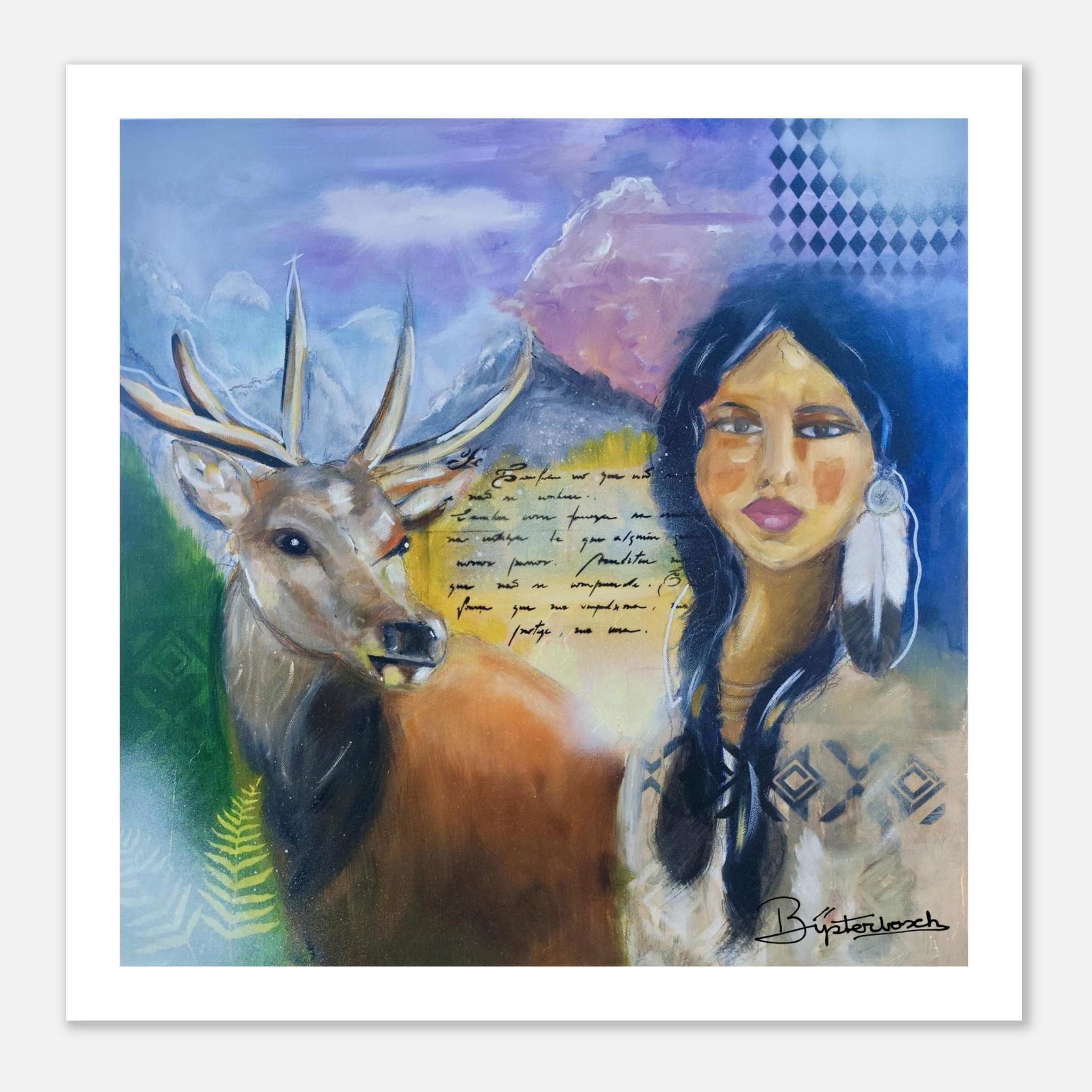 Vibrant colors bring the scene to life, evoking harmony and inviting viewers to pause and reflect. Subtle details—such as the woman’s traditional attire and the deer’s expressive gaze—add emotional depth, encouraging contemplation about the stories and wisdom nature shares with us.